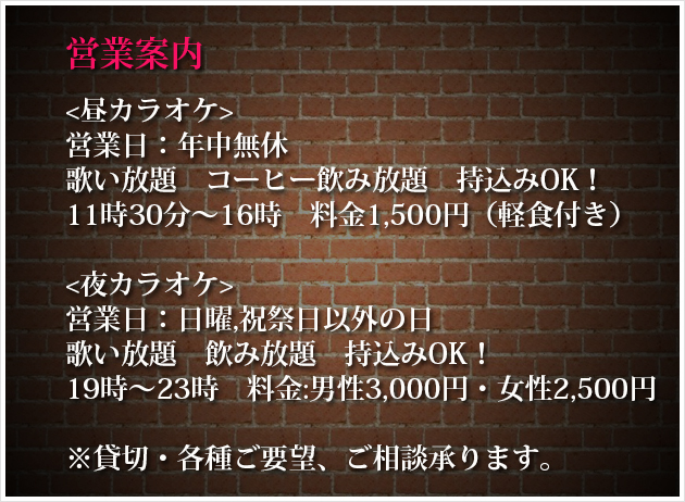 気さくなマスターとママさんがお出迎え、昼はコーヒーを飲みながら、夜はお酒と一緒にカラオケを楽しめます♪居心地の良いお店作りをしておりますので地域の方々は是非とも一度、ご来店くださいませ。
