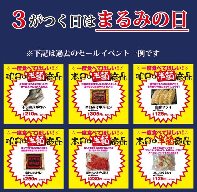 まるみ商店さんは新鮮な野菜や加工食品、冷凍食品などさまざまな品を取り揃えて販売している地域のアンテナショップ!地元産に拘り販売する事で新鮮な物をより美味しく、地元企業との提携でより安く販売しているのが魅力です!3がつく日は「まるみの日」お得なイベントやポイントアップ、半額セールなどもゲリラ的に実施するので見逃せない!詳細はInstagramでチェックしましょう♪