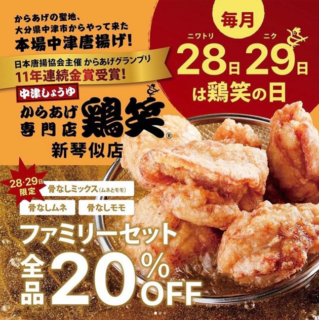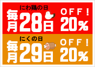 鶏笑 新琴似店では毎月「にわ鶏の日」と「にくの日」におすすめ商品を20%オフにて提供しております。
